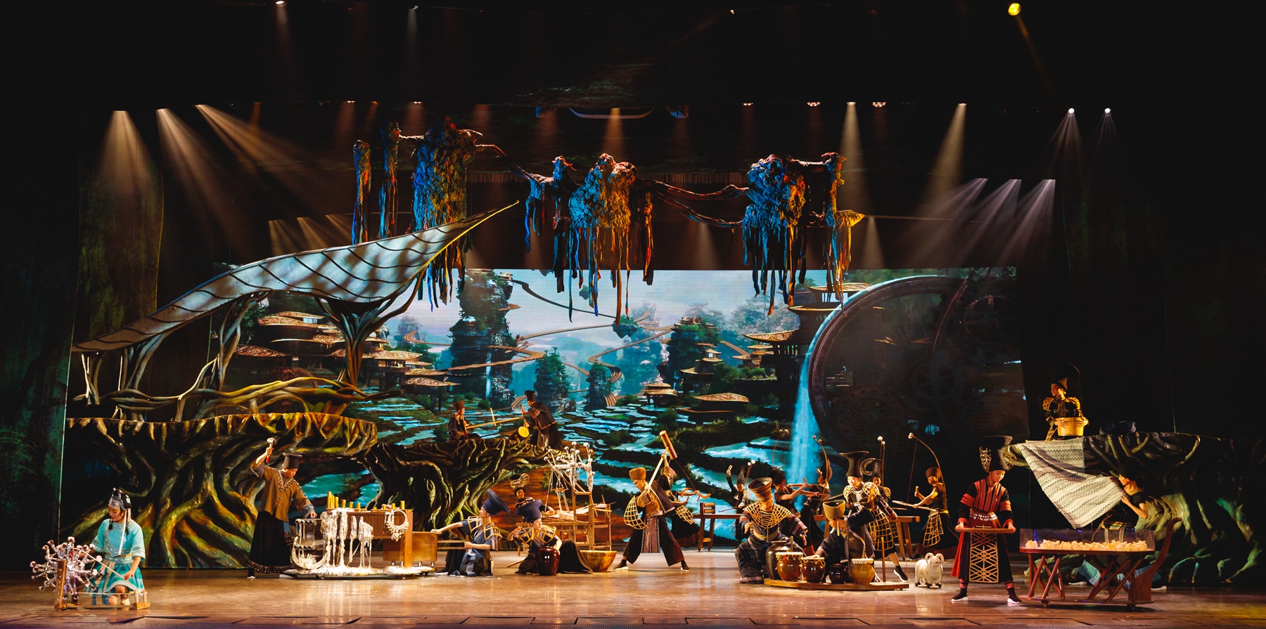 清晨,張家界大山中的古老山寨在雞鳴犬吠聲中蘇醒,山民們?cè)诔筷乩锩β灯鸶髯缘臓I(yíng)生。于是缸、罐、盆、碗變成了樂(lè)器,彈棉花、篩米、紡紗、鋸木合奏成了優(yōu)美的旋律,苗族水腔、土家族打溜子等非物質(zhì)文化遺產(chǎn)依次呈現(xiàn)……